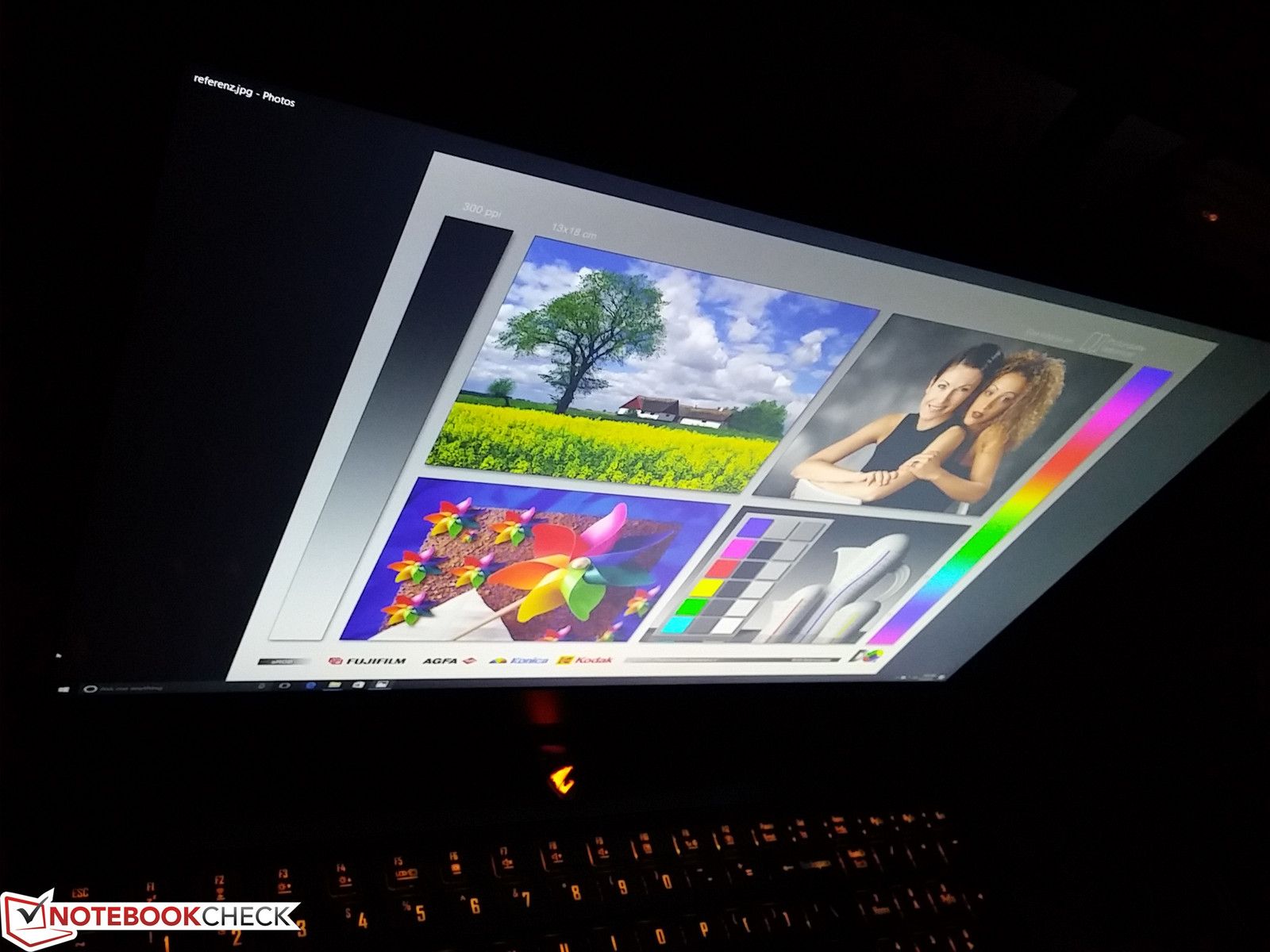 Unser Testgerät verwendet ein WQHD+-Panel mit 2.880 x 1.620 Pixeln und dem etwas ungewöhnlichen Bildformat. Eine kurze Suche in unserer Datenbank zeigt, dass der Bildschirm von Panasonic auch im Gigabyte P35X v3, dem ThinkPad T540p und sogar dem älteren Aorus X5 zum Einsatz kommt. Der Kontrast ist sehr gut und die Helligkeit ist innerhalb des Gebäudes mehr als ausreichend, doch die Ausleuchtung ist nicht optimal. Vor allem unten links ist das Bild etwas dunkler. Texte und Bilder sind jedoch sehr scharf und Inhalte wirken nur auf einem weißen Hintergrund minimal körnig.
