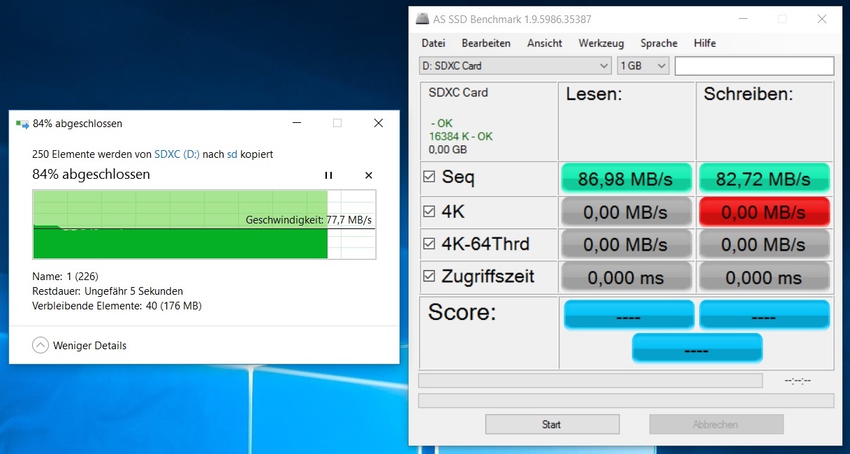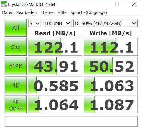 Die Performance des Kartenlesers siedelt sich im Mittelfeld an. Rund 87 MB/s beim sequenziellen Lesen und 78 MB/s beim Übertragen von ca. 1 GB Fotos im jpg-Format reizen das theoretische Limit unserer Referenzkarte Toshiba Exceria Pro SDXC 64 GB UHS-II (max. 260 MB/s) nicht ansatzweise aus. Jedoch schneidet die Konkurrenz kaum besser ab. Das HP Omen 17 und der hauseigene 17-Zoll-Bruder Gigabyte P57X v6 kommen auf ein ähnliches Ergebnis. Das MSI GS73VR schafft sogar nur USB-2.0-Geschwindigkeit.