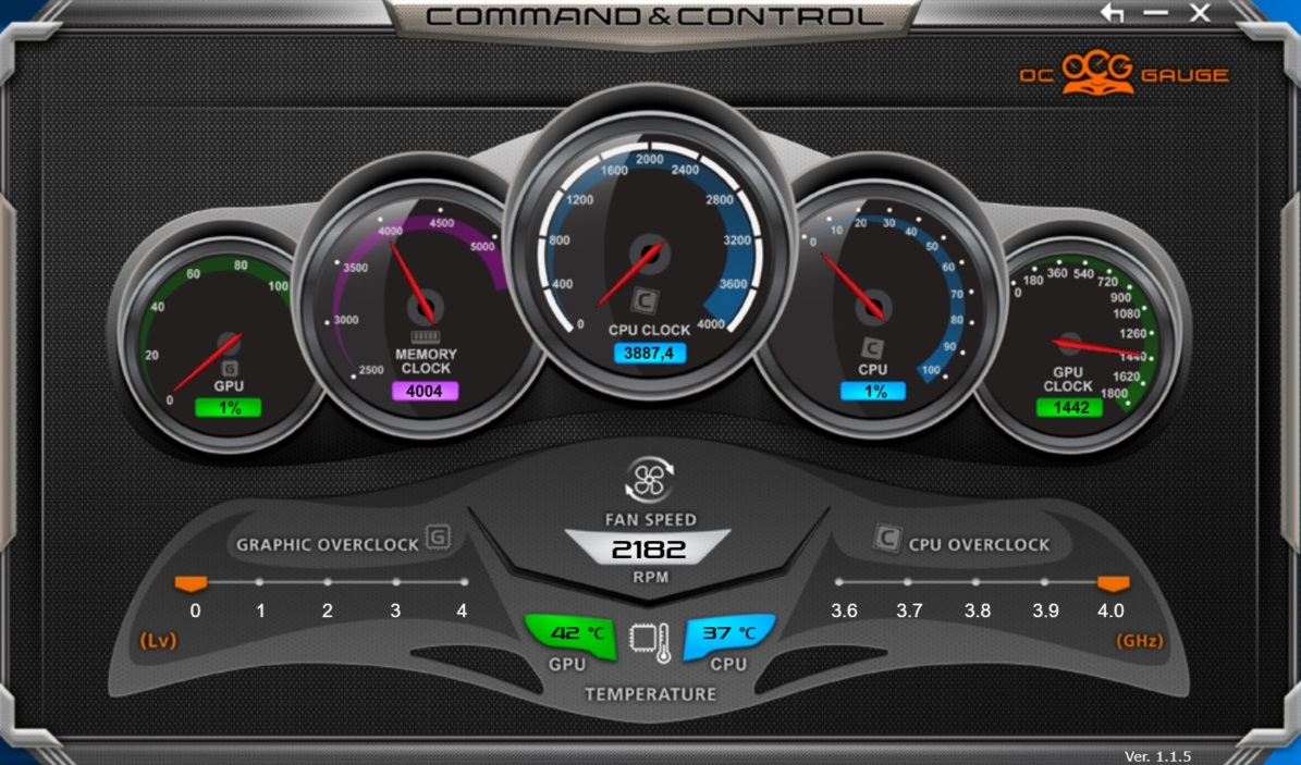 Respekt gebührt Gigabyte für die clevere Software. An dieser Stelle wäre vor allem das Tool Command & Control zu nennen, das mehrere Features auf einer übersichtlichen Oberfläche vereint. Interessant sind nicht zuletzt „Fan Control“ (Lüfterverhalten inklusive manueller Steuerung) und „OC Gauge“ (Systemüberwachung mit optionaler GPU-Spritze). Der Punkt „OC Launcher“ ist ebenfalls spannend. Hier folgt Gigabyte dem aktuellen Overclocking-Trend beschleunigt den Core i7-6820HK ab Werk auf 4,0 GHz. Unsere Messungen wurden jeweils mit der Lüfterstufe „Normal“ durchgeführt. Der OC Launcher stand entweder auf dem minimalen (Idle-Tests) oder dem maximalen Wert (3D-Tests).