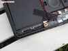 Um das Gehäuse öffnen zu können, benötigt man keinen Kreuz-, sondern einen Torx-Schraubendreher. Mit diesem muss man 12 Schrauben von der Unterseite entfernen, bevor der Boden freigegeben wird. Hinter der Abdeckung verbergen sich der Akku, die Lautsprecher, der Funkadapter und vier RAM-Bänke für maximal 64 GB. Daneben gibt es noch einen 2,5-Zoll-Schacht und drei m.2-Slots des Typs 2280 mit NVMe/PCIe-Technik. Beim Kühlsystem hat sich Gigabyte für zwei Lüfter und 6 Heatpipes entschieden. GPU und CPU sind wie üblich verlötet.