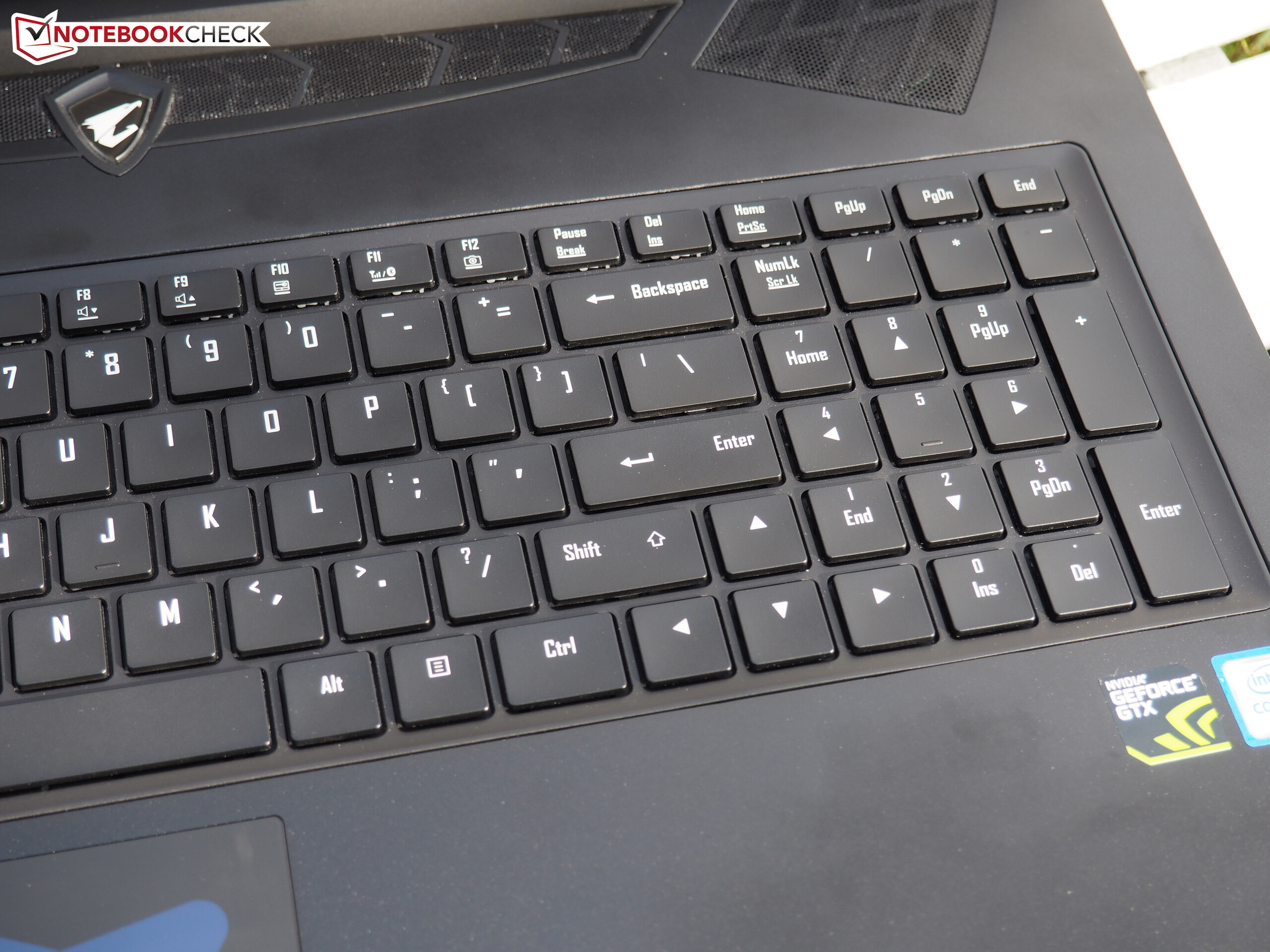 Die Eingabegeräte wurden deutlich überarbeitet. Fühlte sich das Keyboard der Vorgänger noch recht schwammig und undefiniert an, sind die Tasten jetzt spürbar fester und geben ein besseres Feedback ab. Auch bei der Tastengröße und dem (englischen) Layout macht Gigabyte fast alles richtig. Wegen des links angebrachten Makrofelds muss man sich trotzdem eine Weile an das Keyboard gewöhnen. In der Anfangszeit erwischten wir beim Tippen oder Zocken oft die falsche Taste. Die Beleuchtung hat der Hersteller ebenfalls optimiert. Inzwischen kann jede Taste mit RGB-Support aufwarten. Inklusive der verschiedenen Zonen und Beleuchtungsmodi ist eine sehr gute Individualisierung möglich.