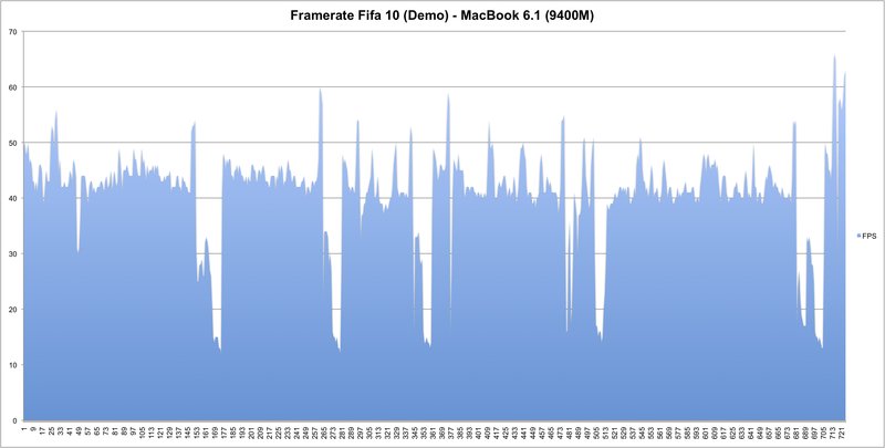 Im praktischen Spieletest unter Windows Vista zeigt sich die 9400M für anspruchslose Spiele durchaus geeignet. Das neueste Fifa 10 war zum Beispiel in der nativen Auflösung von 1280x800 und hohen Details (alles Optionen an oder auf hoch) mit durchschnittlich 40 fps flüssig spielbar (minimal 12, maximal 67 fps). Bei minimalen Details in 800x600 schraubt sich die Framerate auf 106.7 fps (minimal 70, maximal 166 fps).
