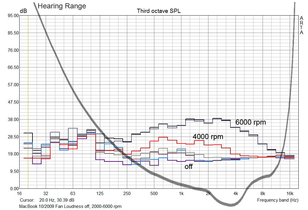 Maximal drehte der Lüfter mit etwa 4500 rpm im Test, meist 3000. Die unterste Linie ist die Geräuschkulisse mit ausgeschalteten Notebook (Umgebungsgeräusche). Nur minimal oberhalb liegt der Lüfter in den normalen Lastzuständen 3000 - 3500 rpm. Die rote Linie ist in etwa das Maximum der gemessenen Lüfterlautstärke. 6000 rpm konnten wir nur per "smcfancontrol" einstellen.
