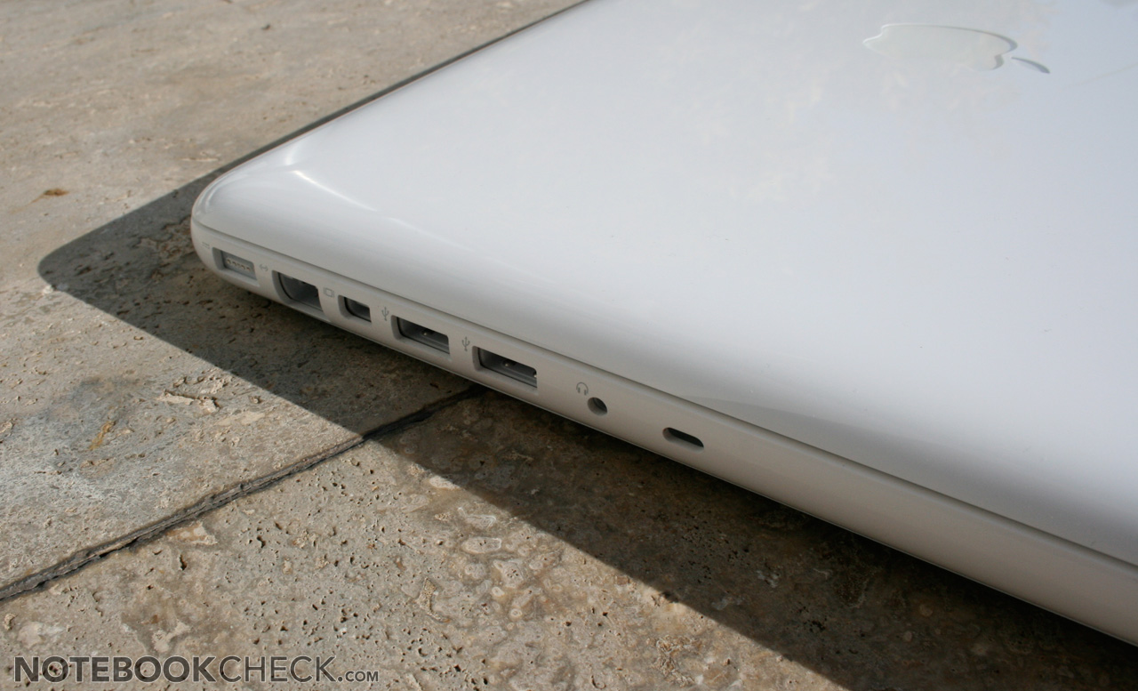 Wie bei Apple üblich, ist die Schnittstellenausstattung des neuen weißen Plastik-MacBooks eher karg. Im Vergleich zum Vorgänger wurde sogar der FireWire Anschluss noch eingespart. Es bleibt bei den zwei USB Ports, die dem User schnell zu wenig werden könnten. Der verbaute Mini-Displayport kann zwar digitale Monitore mit hohen Auflösungen ansteuern, benötigt jedoch für alle Bildschirme außer den neuen Apple Geräten einen kostenpflichtigen Adapter.