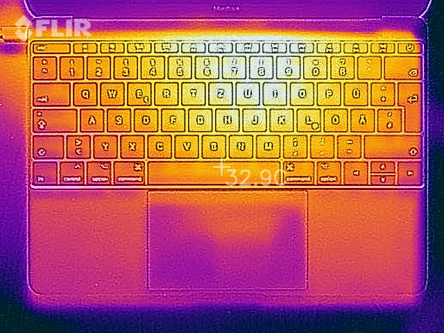 Keine nennenswerten Veränderungen ergeben sich bei der Entwicklung der Oberflächentemperaturen im Vergleich zum Vorgänger. Dies war allerdings auch nicht zu erwarten, zu gering fallen die Veränderungen aus. Während das MacBook 12 im Regelbetrieb mit Office-Aktivitäten und Webbrowsing durchwegs kühl bleibt, stellen sich unter andauernder Last Hotspots in den zentralen hinteren Bereichen an der Ober- und Unterseite ein. Mit knapp über 40 °C kommt es aber auch hier nicht zu Beeinträchtigungen.