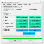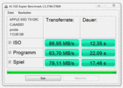 Beim integrierten Massenspeicher setzt Apple auch beim kleinen Air 11 ausschließlich auf schnelle SSD-Lösungen. Im Gegensatz zu 13-Zoll Modell hat man beim 11-Zöller die Wahl zwischen 64GB Bruttokapazität oder 128GB. Auch hier verwendet Apple Modelle unterschiedlicher Hersteller, die sich in ihren Leistungsdaten voneinander unterscheiden können. In unserem Testgerät kam eine 128GB SSD zum Zug, und zwar vom Hersteller Toshiba mit der Kennung TS128C. Alternativ dazu sollen auch Einheiten von Samsung (SM128C) in den aktuellen MacBook Air eingesetzt werden. Diese sollen verschiedenen Berichten zufolge etwas schneller sein als ihre Toshiba-Pendants.