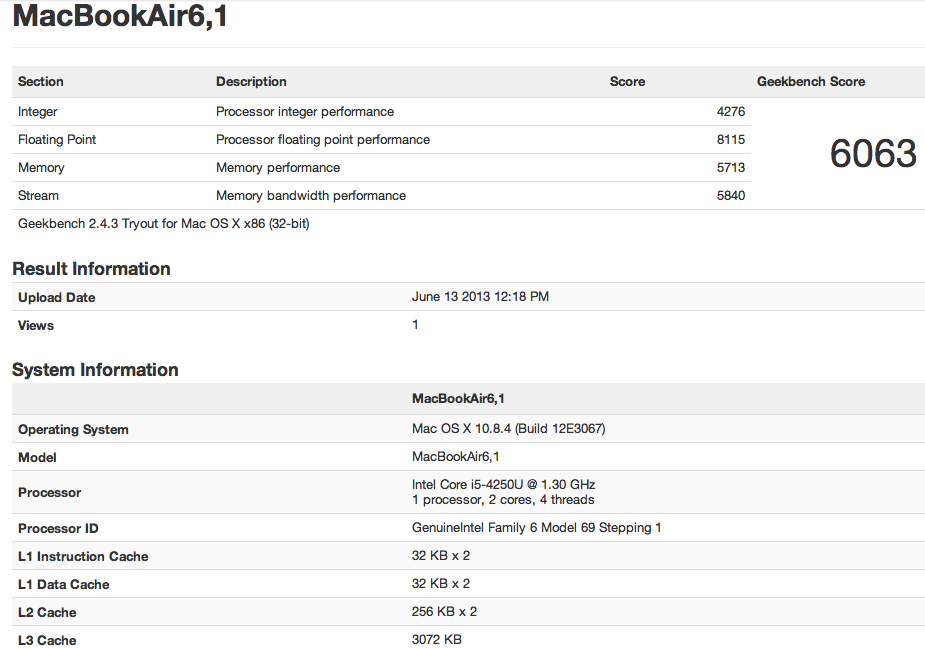 Im Geekbench erreicht unser aktuelles MacBook Air 2013 mit der i5-4250U CPU einen Gesamtscore von 6.063 Punkten. Das entspricht einem Zuwachs von knapp 7 %. Zufolge den Detailscores kann das aktuelle Refresh vor allem bei der Gleitkommaberechnung als auch bei der Speicherbandbreite an Performance zulegen.