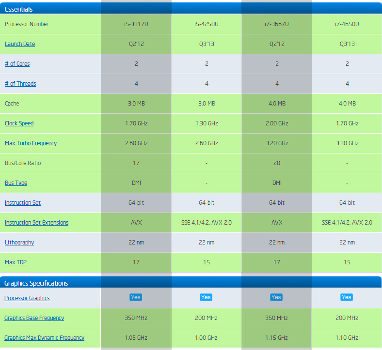 | Prozessor | Intel Core i5-4250U 1,3 GHz Dual-Core | Intel Core i7-4650U 1,7 GHz Dual-Core | Intel Core i5-4250U 1,3 GHz Dual-Core | Intel Core i7-4650U 1,7 GHz Dual-Core |