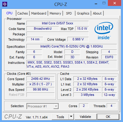 Die Broadwell-Architektur ist mit diesem Upgrade auch bei Apple angekommen. Unsere Konfiguration des MacBook Air verwendet eine Intel Core i5-5250U. Der Prozessor arbeitet mit zwei Kernen und vier Threads. Der Basistakt wird im Vergleich zu unserem alten Testmodell um 100 MHz angehoben und beträgt nun 1,6 GHz. Mittels Turbo-Modus sind Taktraten von bis zu 2,7 GHz möglich. Intel besagt laut Datenblatt eine maximale Leistungsaufnahme von 15 W (TDP).