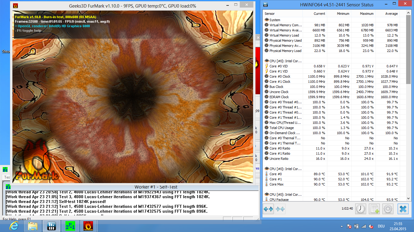 Im Auslastungstest unter Windows 8.1 verwenden wir die Programme FurMark und Prime95. Hier sinkt der Prozessortakt auf 900 MHz und verharrt deutlich länger auf dieser Frequenz. Im Windows-Betriebssystem wird schon bei über 92 °C gethrottelt (Mac OS X bei 100 °C). Die Konsequenz ist, dass die CPU im Mac-Betriebssystem etwas länger mehr Leistunng bringen kann. Wie schon unter Mac OS haben wir nach dem Stresstest unter Windows, einen Benchmark zum Vorher/Nachher-Vergleich gestartet. Der 3DMark 11 erzielt mit 1.359 Punkten ebenfalls gleiche Punktzahlen wie im Normalbetrieb.