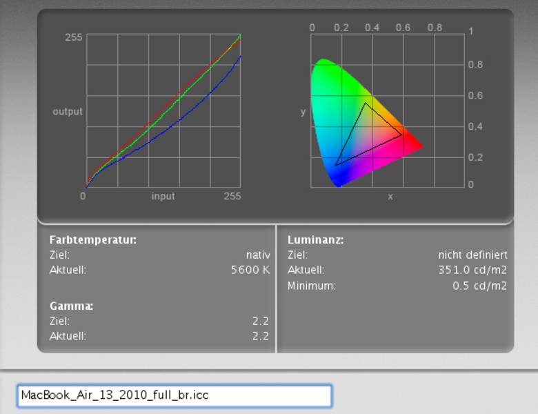 Der darstellbare Farbraum entspricht in etwa dem des weißen MacBook aus 2010 und dem 11" MacBook Air. Dadurch ist er deutlich kleiner als der sRGB Farbraum und auch der Farbraum der MacBook Pro Modelle.