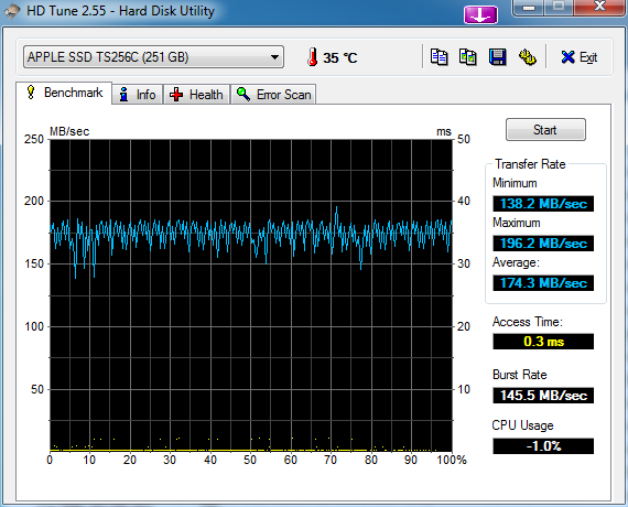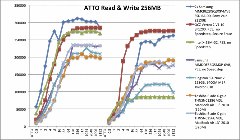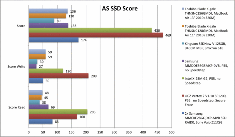 Die Performance (hauptsächlich die Leseraten) der 256GB Version war im Test etwas besser als die 128GB Version im 11" MacBook Air. Im Vergleich zu aktuellen High-End SSDs von Intel (X25-M) oder Sandforce (z.B. OCZ Vertex 2) ist die Toshiba SSD jedoch deutlich schwächer. Beim Gesamtscore des AS SSD Benchmarks liegt sie z.B. auf dem Niveau der Samsung PM800. Günstige Einstiegs-SSDs wie die Kingston SSD Now V bleiben jedoch noch deutlich zurück.