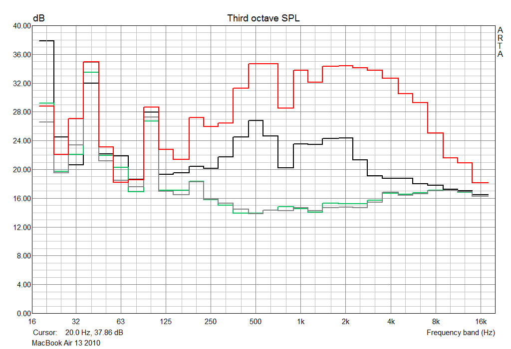 Wie auch im 11" Modell hat Apple in dem flachen Gehäuse Stereo Lautsprecher untergebracht. Diese klingen auch für ihre Baugröße erstaunlich gut. Trotzdem eignen sie sich eher für die anspruchslose Beschallung (wie Internet Radio oder Youtube Videos). Die maximale Lautstärke von 92.5 dB / 98 Sone (Pink Noise; 15cm Abstand) ist durchaus brauchbar, auch bei leisem Quellmaterial. Im Vergleich zum 11" MB Air (siehe Grafik) ist die 13" Version deutlich lauter (11" max. 87.2 dB / 67 Sone).