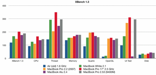 Im Xbench Benchmark ist der Gesamtscore etwas niedriger als erwartet, da unser Test-MacBook im UI Test überraschenderweise nur 14 Punkte erreicht wurden (über 200 sollten es sein). Leider konnten wir aus Zeitgründen dieser Anomalie nicht näher auf den Grund gehen. Der Gesamtscore sollte damit knapp unterhalb dem des MacBook Pro mit aktivierter 9400M Grafik sein.