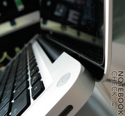 Besonders der abgerundete Displaydeckel erinnert frappierend an das MacBook Air. Auch der Einschaltknopf und die Tastatur wurden übernommen. Das Aluminiumgehäuse wird nur durch das schwarzumrandete Display (mit überliegender Glasschicht) und der schwarzen Kunststoffabdeckung des Scharniers (um den WLAN- und Bluetooth-Empfang zu gewährleisten) kontrastiert.