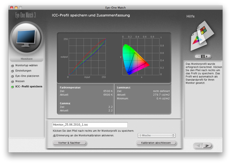 Wie auch beim 2009er Modell, bietet das MacBook Pro 13 einen erweiterten Farbraum, welcher ungefähr den sRGB Raum abdecken kann. Standardmäßig kalibriert Apple die Farben etwas "falsch", zu Gunsten einer besseren Blickwinkelstabilität. Unsere Kalibration mittels iOne Display2 können sie hier herunterladen: ICC File
