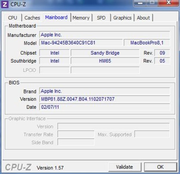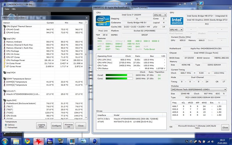 Der Verdacht liegt also Nahe, dass hier der Core i7-2620M nicht ganz zu seiner Höchstleistung unter Windows auflaufen kann. Dies untermauert auch ein Blick auf die Taktraten während der Last. Zuerst fällt auf, dass Apple unter Windows anscheinend den Turbo Boost des i7-2620M deaktiviert hat. Mehr als 2.7 GHz Taktfrequenz konnten wir mit Tools wie HWInfo32 nicht auslesen. Zusätzlich kann es auch zu Temperatur- oder stromverbrauchsbedingten Throttling kommen, dazu aber später mehr.