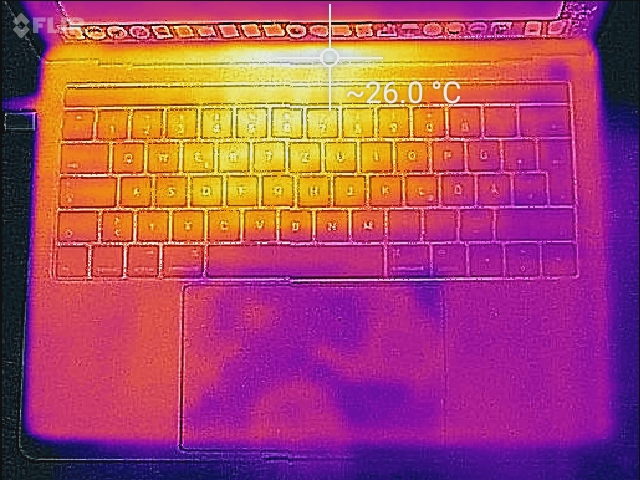 Im Leerlauf und bei leichter Belastung wärmt sich das MacBook überhaupt nicht auf und bleibt angenehm kühl. Unter Last konnte Apple die schnelleren Komponenten mit dem zweiten Lüfter gut kompensieren, denn im Vergleich zum Modell ohne Touch Bar ermitteln wir beinahe identische Durchschnittswerte von rund 36 °C auf der Ober- und Unterseite. Vor allem der hintere Bereich der Oberseite wird mit bis zu 45 °C etwas wärmer, im Gegenzug ist die Handballenauflage samt Trackpad jedoch kühler. Probleme sollte es bei dem Betrieb auf dem Schoß aber auch hier nicht geben.