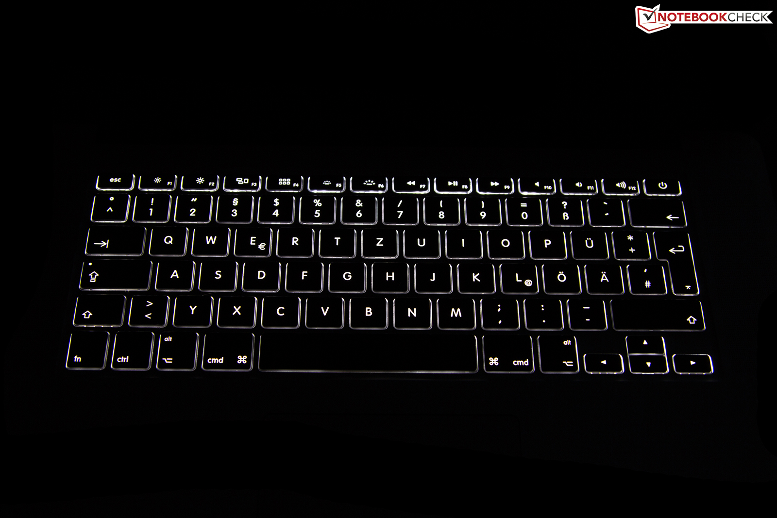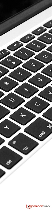 Das Chiclet-Style Keyboard (Einzeltasten) hat Apple optisch sowie Layout-technisch nicht verändert. Lediglich der Power-Button wurde neu aufgenommen und befindet sich nun oben rechts in der Ecke der Tastatur. Dort befindet sich bei den Modellen mit optischem Laufwerk die Taste zum Auswerfen des Datenträgers. Des Weiteren haben sich entsprechend dem Betriebssystem die Icons auf den Tasten F3 und F4 geändert. Über diese lassen sich die Tools Mission Control und das Launchpad starten. Weiterhin integriert ist auch eine LED-Hintergrundbeleuchtung, die durch 16 unterschiedliche Stufen entsprechend der Umgebung eingestellt werden kann. Das Tippgefühl überzeugt weiterhin, wobei der Tastenhub bei dieser Neuauflage verringert wurde. Dadurch wird die Tastatur nochmals straffer. Subjektiv gefällt dem Redakteur diese Anpassung sehr gut. Zusammen mit dem großzügigen Layout kann das Testgerät damit wieder eine hohe Wertung abräumen.