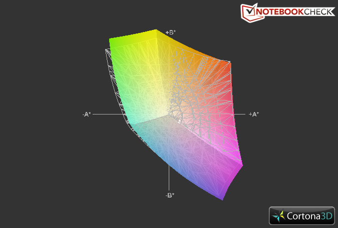 Bei der professionellen Ausrichtung dieses Gerätes darf auch ein Blick auf den darstellbaren Farbraum nicht fehlen. Das MacBook Pro 15 Late 2011 mit glänzender Standardanzeige schneidet im Vergleich leicht besser ab, wobei das MacBook mit Retina-Display den Referenzfarbraum sRGB nahezu vollständig bedienen kann. Das Samsung Serie 9 900X4C-A04DE Notebook kann in diesem Kontext nicht mithalten. Der Adobe RGB-Standard kann aber auch vom neuen Apple-Notebook nicht abgedeckt werden. Insgesamt eine gute Vorstellung, mit der auch professionelle Nutzer im mobilen Einsatz auf ihre Kosten kommen.