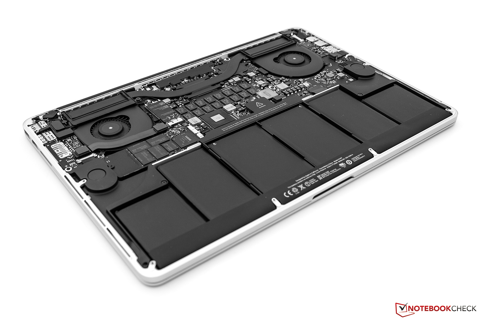Im mobilen Einsatz sorgt bei diesem Modell ein großer Lithium-Polymer-Akku mit einer Kapazität von 95 Wattstunden für entsprechende Laufzeiten. Das normale MacBook Pro 15 bietet hingegen nur eine Kapazität von 77,5 Wattstunden. Dies entspricht einer Differenz von 19,4 Prozent. Andererseits ist der Akku nun in das Gehäuse geklebt, wodurch der Austausch kompliziert und teurer geworden ist. Laut Apple-Preisliste sind nun 199 Euro (UVP) anstatt 129 Euro fällig. Angesichts der Größe des Energiespeichers ist der Preis aber noch akzeptabel, zumal dieser mindestens 1000 Ladezyklen halten soll.