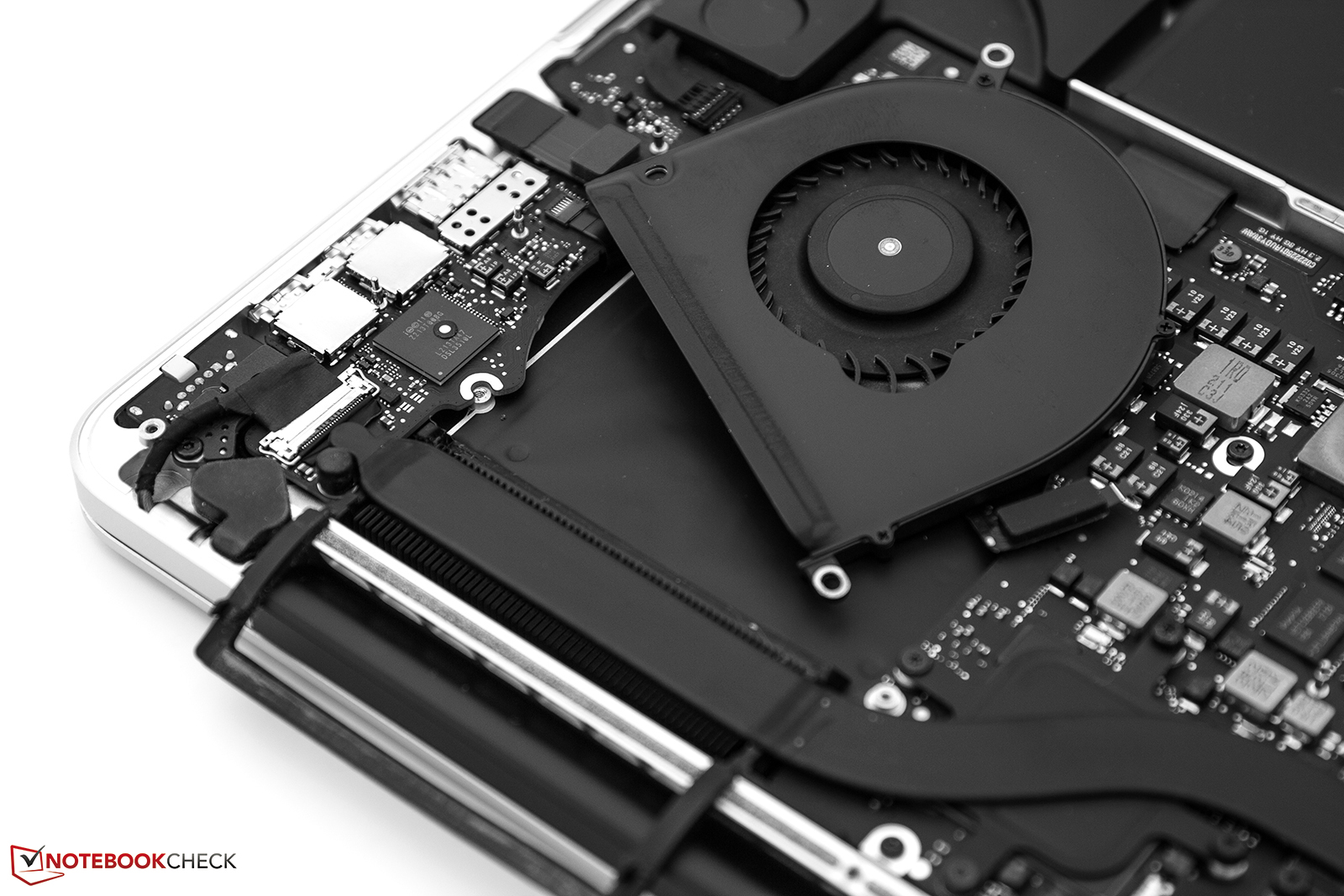Ein Teil der Neuentwicklung des MacBook Pro Retina ist auch das angepasste Kühlsystem mit zwei asymmetrischen Gehäuselüftern, die den entstehenden Geräuschpegel auf unterschiedliche Frequenzen verlagern sollen. Subjektiv soll das Gerät dadurch leiser arbeiten. Im Leerlauf liegt der von uns gemessene Pegel bei konstant 29,4 dB(A), wobei die Lüfter bei rund 2000 Umdrehungen pro Minuten nicht zu hören sind. Der Messwert entspricht dabei dem Grundpegel des Raumes ohne störende Nebengeräusche. Der Lüfter ist aufgrund der Komponenten die einzige Geräuschquelle. Bei der Wiedergabe eines YouTube-Flash-Videos bleibt das MacBook ruhig. Mit maximal 2300 Umdrehungen pro Minute dreht der Lüfter kurzzeitig minimal höher.