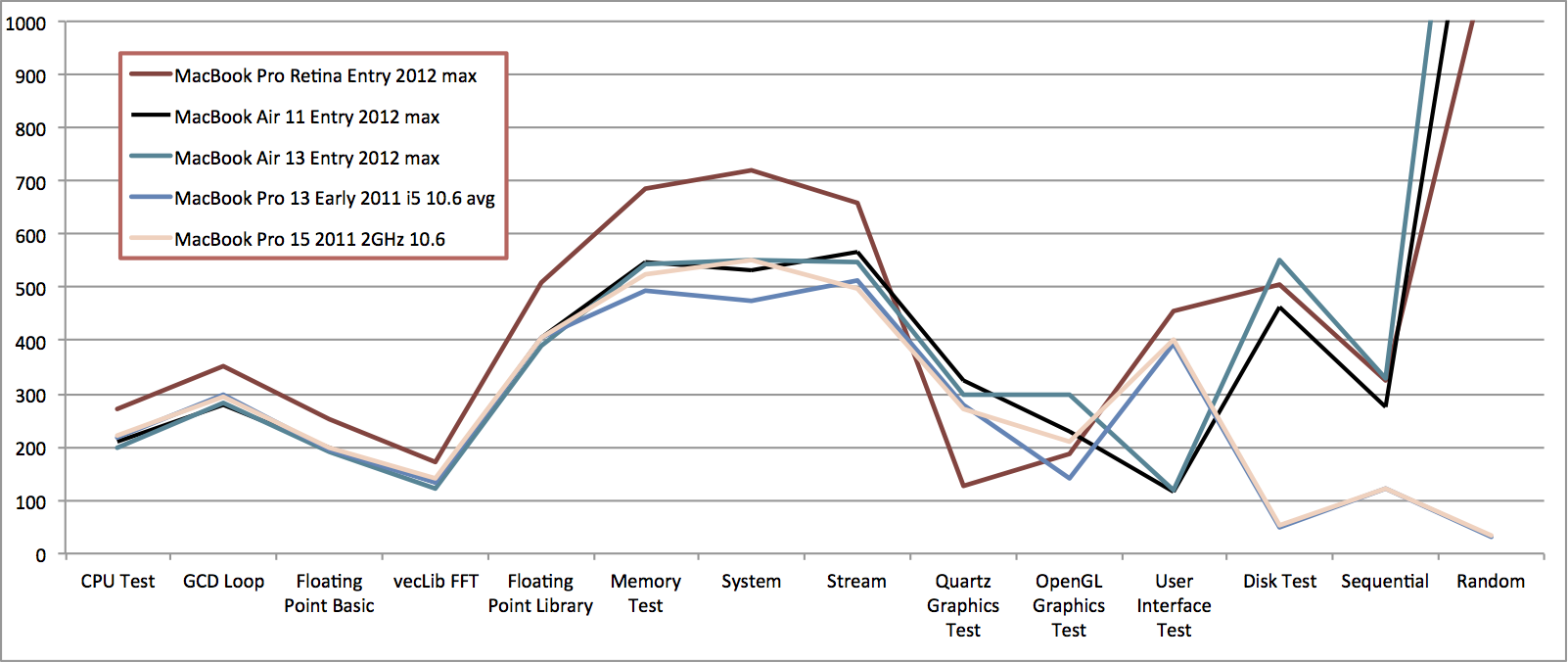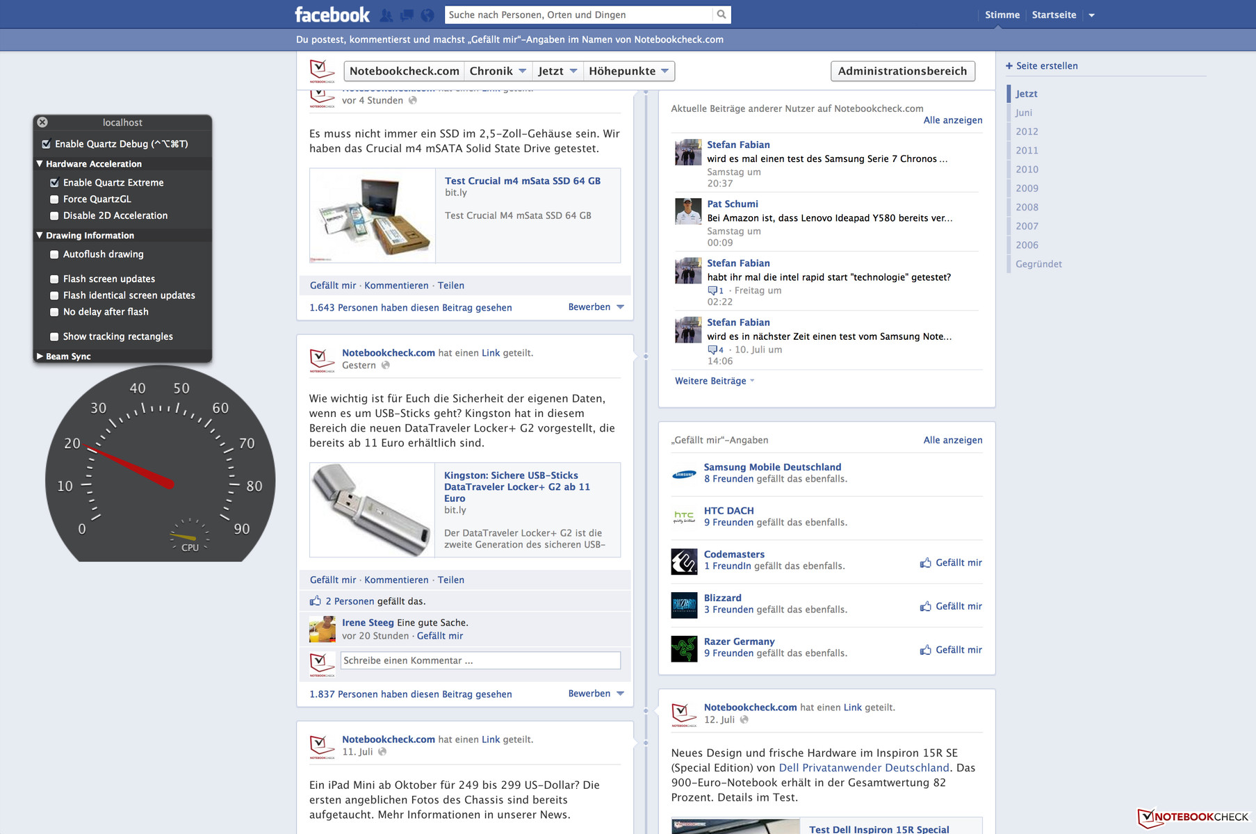 Ein weiteres Tool für die Bewertung heißt Xbench und ist mit den Systembenchmarks von Futuremark zu vergleichen. Aufgrund der teils stark schwankenden Ergebnisse ist in der Grafik der jeweilige Maximalwert aus fünf Messungen eingetragen. In der Grafik ist gut zu erkennen, dass das Retina-MacBook in vielen Bereichen die Spitzenposition für sich behauptet. Lediglich im Quartz Graphics Test fällt die Leistung im Vergleich zu den anderen Geräten sichtbar ab. Das Tool Quarz Debug der Developer Tools von Apple ermöglicht die Anzeige der Bildwiederholungsrate. Beim Surfen im Internet liegt diese beim Scrollen auf der Timeline von Notebookcheck.com auf Facebook zwischen 18 und 24 fps. Laut Anandtech ermöglicht das normale Apple MacBook Pro 15 zirka 50 fps. In der Praxis äußert sich die geringere Bildwiederholung durch ein leichtes Ruckeln. Mountain Lion soll dieses Problem aber lindern.