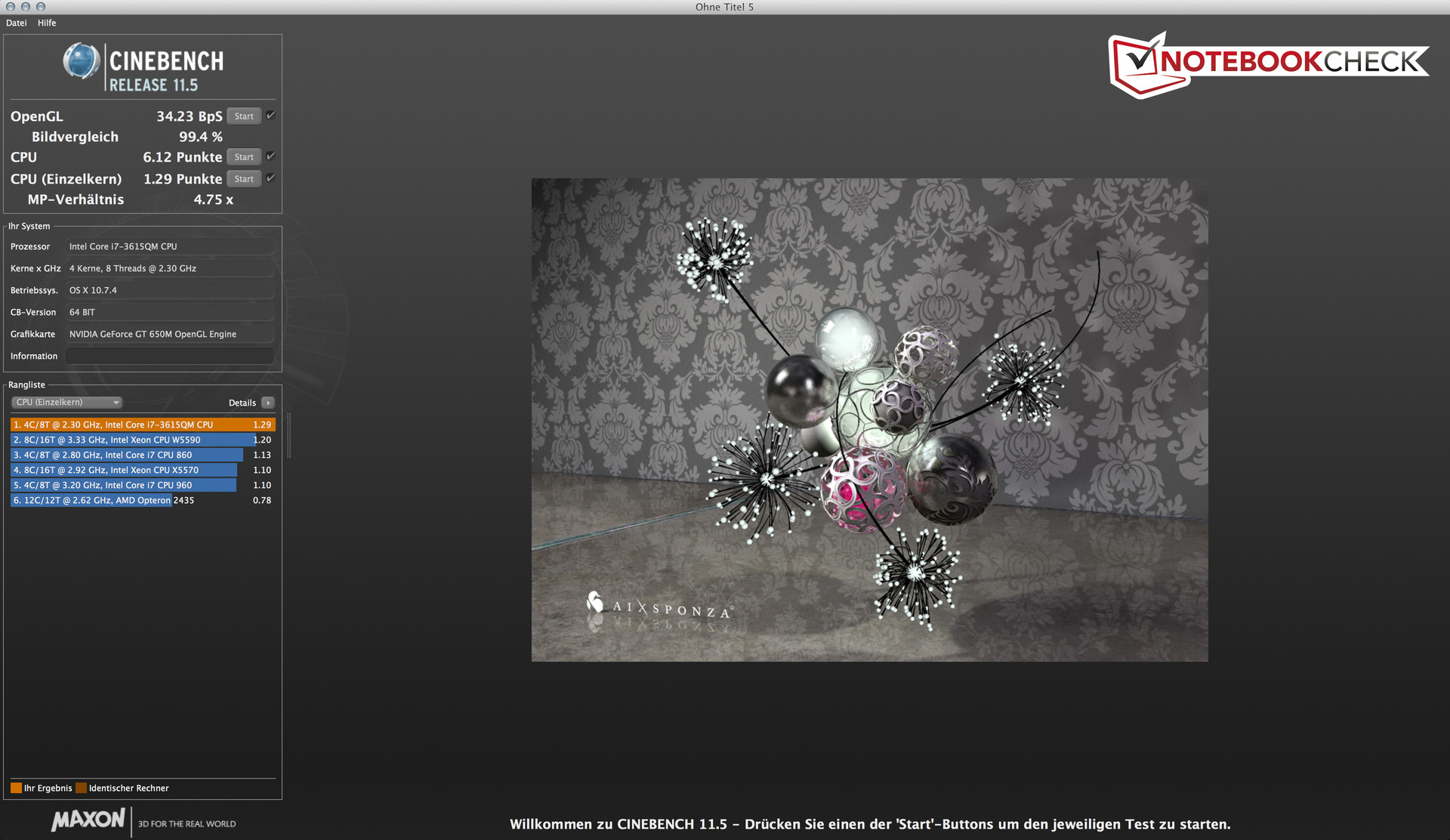 Unter Mac OS X konnten wir kein Throttling feststellen. Zur Überprüfung haben wir die Multi-CPU-Berechnung von CineBench R11.5 in einer Schleife ohne Unterbrechungen ausgeführt. Nach 50 Runden hat sich das Ergebnis nicht verändert.