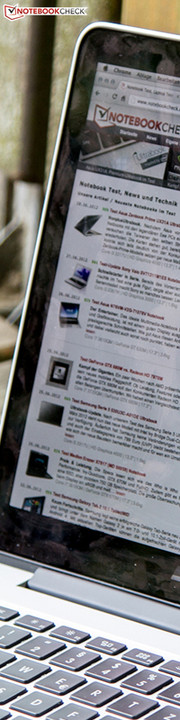 Im Außengebrauch zahlen sich die guten Messwerte aus. Ein Gegenspieler ist allerdings die glänzende Bildschirmoberfläche. Im Vergleich zum normalen Bildschirm der MacBook Pro Serie hat Apple bei diesem Modell nur zwei Schichten vor den Bildschirm gesetzt, wodurch Reflektionen nach eigenen Angaben um 75 Prozent reduziert werden sollen. In der Praxis hinterlässt die Anzeige einen guten Eindruck. Bei maximaler Bildschirmhelligkeit sind Spiegelungen kaum zu erkennen und das Arbeiten im Freien wird nur sehr gering beeinflusst. Bei 50 % Helligkeit nehmen die Spiegelungen zu, wobei der Inhalt trotz Spiegelungen noch zu erkennen ist. Eine matte Variante des Retina-Bildschirms gibt es, auch wenn viele Nutzer im Internet eine solche Option vermissen, bisher nicht. Ein weiteres Feature ist ein Umgebungslichtsensor, der die Beleuchtung der Anzeige automatisch reguliert.