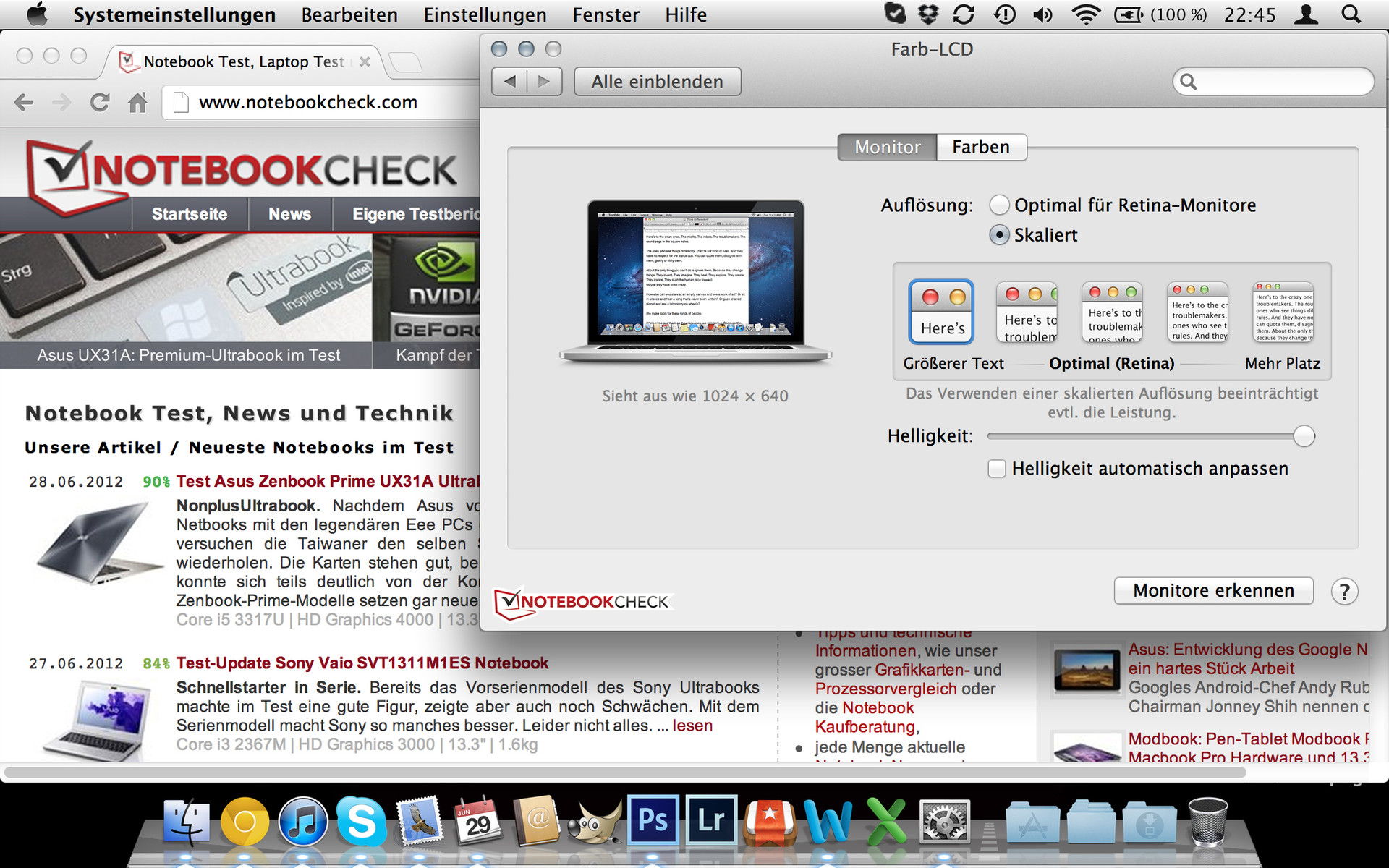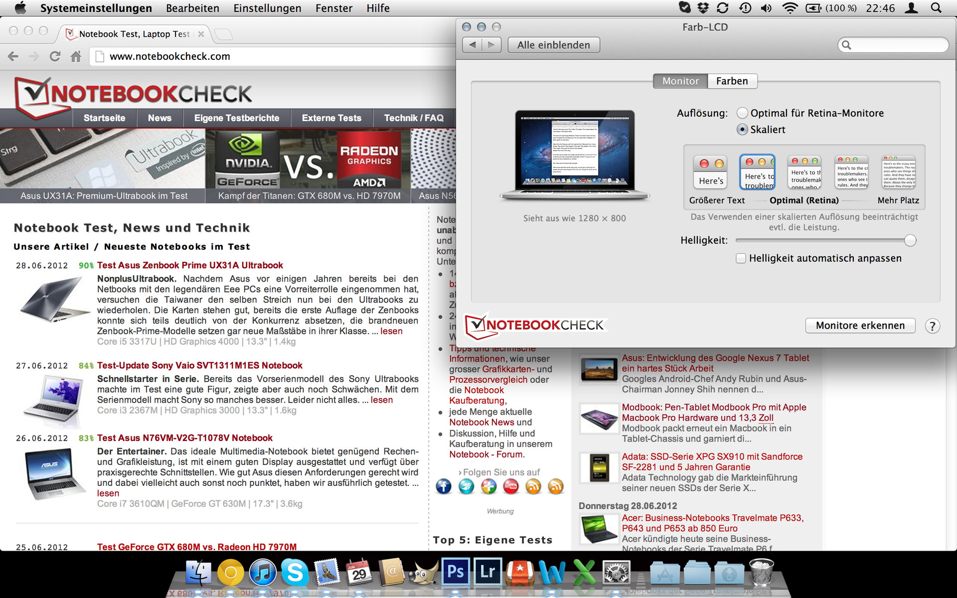 Kommen wir zur Auflösung des neuen Bildschirms. Die native Auflösung liegt bei 2880 x 1800 Pixel, wobei Apple in den Systemeinstellungen diese nicht anbietet. Insgesamt stehen fünf unterschiedliche Auflösungen zur Auswahl: 1024 x 600, 1280 x 800 (MacBook Pro 13), 1440 x 900 (MacBook Pro 15 Standard), 1680 x 1050 (MacBook Pro 15 Hi-Res) und 1920 x 1200 Pixel (MacBook Pro 17). Konkret wird bei gleicher Auflösung die Pixeldichte drastisch erhöht. Bei der Auflösungsstufe „Optimal (Retina)“, die 1440 x 900 Pixel entspricht, werden vier mal so viele Pixel dargestellt, wodurch die Schrift scharf erscheint. Bei der maximalen Einstellung liegt der Faktor noch bei 1,5x der normalen Pixeldichte. Grundsätzlich muss die entsprechende Anwendung aber das sogenannte Pixel Doubling unterstützen, ansonsten haben vier Pixel immer noch die selbe Farbe. Das System-Plug-In SwitchResX ermöglicht die Freischaltung der nativen Auflösung (10 Tage als Testversion kostenlos). Als Anhaltspunkt haben wir einen passenden Screenshot eingefügt. Dieser zeigt, dass man damit kaum effektiv arbeiten kann.