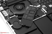 Im Inneren fällt auf, dass Apple den Arbeitsspeicher nun fest verlötet und die SSD sich, wie auch bei den MacBook Air Modellen, auf einem angepassten PCB (Printed Circuit Board) befindet. Der Austausch des Massenspeichers ist bei diesem Gerät daher sehr teuer und schon vor dem Kauf sollte die gewünschte RAM- und SSD-Konfiguration ausgewählt werden. Für 16 GByte RAM verlangt Apple 200 Euro Aufpreis. Normale DDR3-Riegel sind deutlich günstiger, wobei die notwendigen Slots mehr Platz im Gehäuse beanspruchen. Einzig die SSD lässt sich also theoretisch selbst aufrüsten. Durch das neue Format (auch nicht Kompatibel zu den MacBook Air) muss man jedoch erst auf Dritthersteller warten. Kostengünstig (wie bei 2.5" SSDs) wird die Speicherweiterung jedoch sicher nicht.