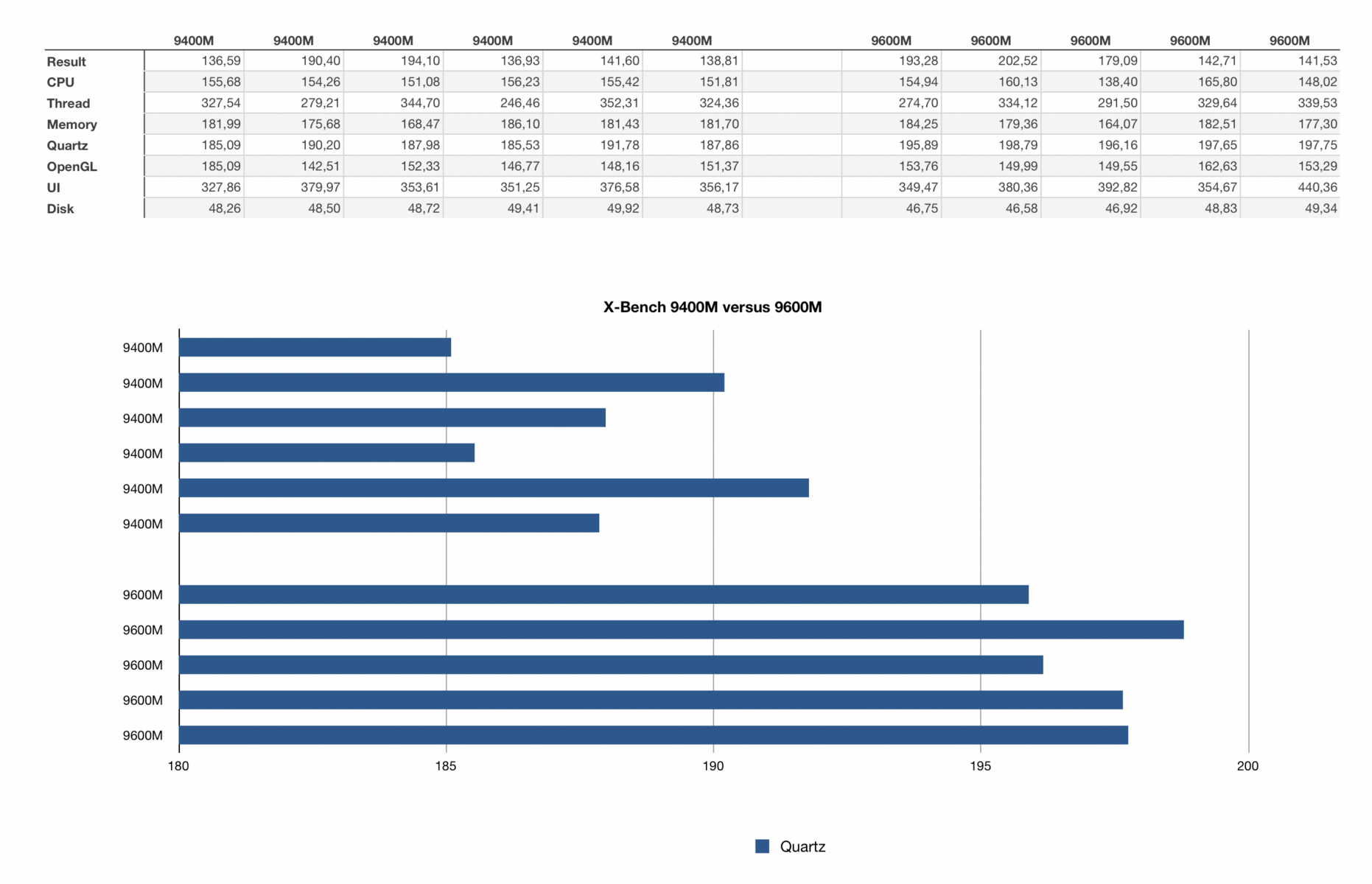 Im Cinebench R10 sieht man deutlich den Performanceunterschied zwischen 9400M und 9600M GT Grafik (im OpenGL Subtest).