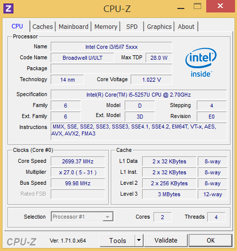 Der in unserer Einstiegskonfiguration verbaute Core i5-5257U kommt mit einem Basistakt von 2,7 GHz daher und kann mittels Turbo Boost Frequenzen von bis zu 3,1 GHz erreichen. Optional bietet Apple ein Upgrade auf den Core i5-5287U (2,9 - 3,3 GHz, 100 Euro Aufpreis) oder Core i7-5557U (3,1 - 3,4 GHz, 350 Euro Aufpreis) an. Abseits der Taktdifferenzen sowie eines etwas größeren L3-Caches der i7-Version unterscheiden sich die genannten Modelle jedoch kaum: Alle drei verfügen über jeweils zwei Prozessorkerne sowie Hyper-Threading zur parallelen Bearbeitung von bis zu vier Threads.