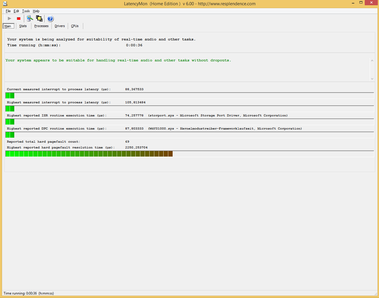 Leider agiert das MBP nicht immer so leise: In 3D-Anwendungen klettert der Lärmpegel innerhalb weniger Minuten über die 40-dB(A)-Grenze, wobei auch hier Windows (45,6 dB(A), 5.400 U/min, rote Kurve) etwas höhere Werte als OS X (44,0 dB(A), 5.200 U/min, grüne Kurve) produziert. Unabhängig von der Drehzahl lässt sich das Lüfterrauschen als nicht übermäßig hochfrequent und angenehm gleichmäßig beschreiben. Gemessen an der Leistungsaufnahme, auf die wir später noch genauer blicken werden, hat Apple damit ein höchst effektives Kühlsystem abgeliefert.