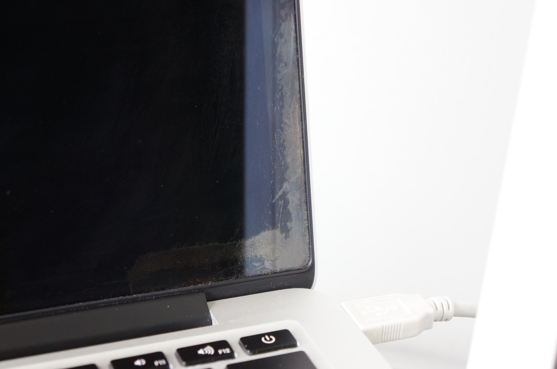 Obwohl wir das Display prinzipiell als Glare-Panel bezeichnen würden, reflektiert es das Umgebungslicht etwas weniger stark als die meisten Konkurrenzmodelle. Dies dürfte vor allem der speziellen Oberflächenbeschichtung zu verdanken sein, die jedoch zuletzt vermehrt für Negativschlagzeilen gesorgt hat: Unter dem Schlagwort "Staingate" klagen mittlerweile hunderte Nutzer im Netz über glänzende Flecken und Verfärbungen, die sich teils nach weniger als einem Jahr bilden und danach stetig wachsen. Auf die Herstellergarantie kann man in diesem Fall leider nicht zwangsläufig vertrauen – oftmals scheint Apple den Fehler als kosmetisches Problem einzustufen und bietet betroffenen Kunden nur eine rund 800 US-Dollar teure Reparatur an. Auch in unserer Redaktion ist ein im Herbst 2013 gekauftes MacBook Pro Retina 13 betroffen. Es bleibt abzuwarten, ob die 2015er-Generation hiervon verschont bleibt.