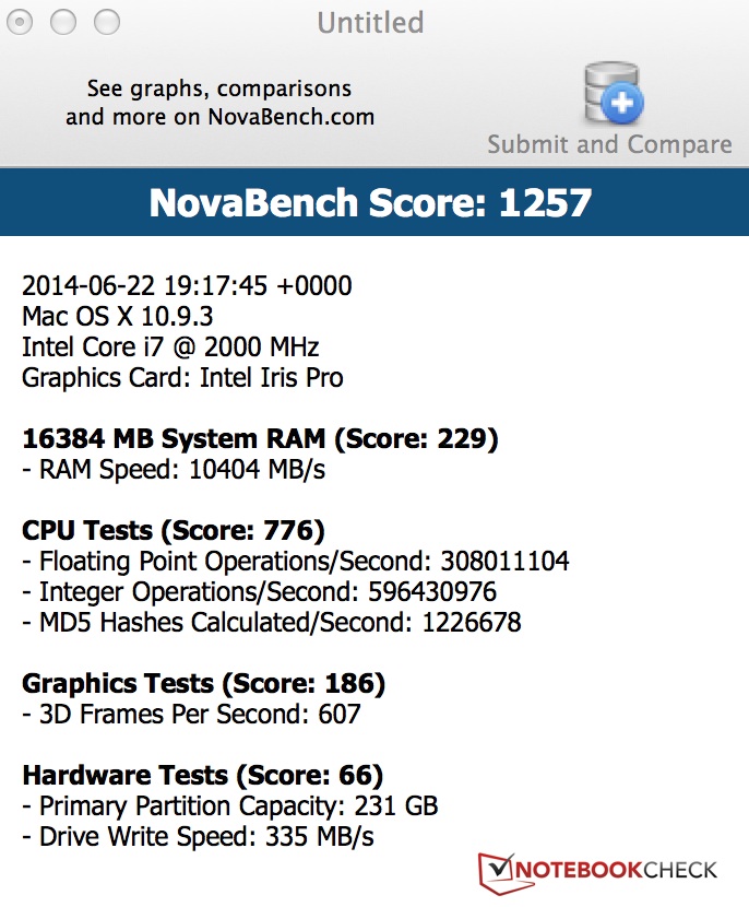 Rein subjektiv ist die Arbeitsgeschwindigkeit, und besonders die Reaktionsgeschwindigkeit, äußerst schnell. Das wird unter Windows auch durch unseren PCMark 7-Score bestätigt. Mit 5.842 Punkten liegt das MacBook ungefähr gleichauf mit dem Dell XPS 15 und dicht dahinter folgt das erste Retina aus 2012 mit einer Punktzahl von 5.545. Schlusslicht ist dank langsamer Magnetfestplatte das Samsung ATIV Book 8 mit weniger als der Hälfte der vom Apple MacBook Pro Retina erreichten Punkten.