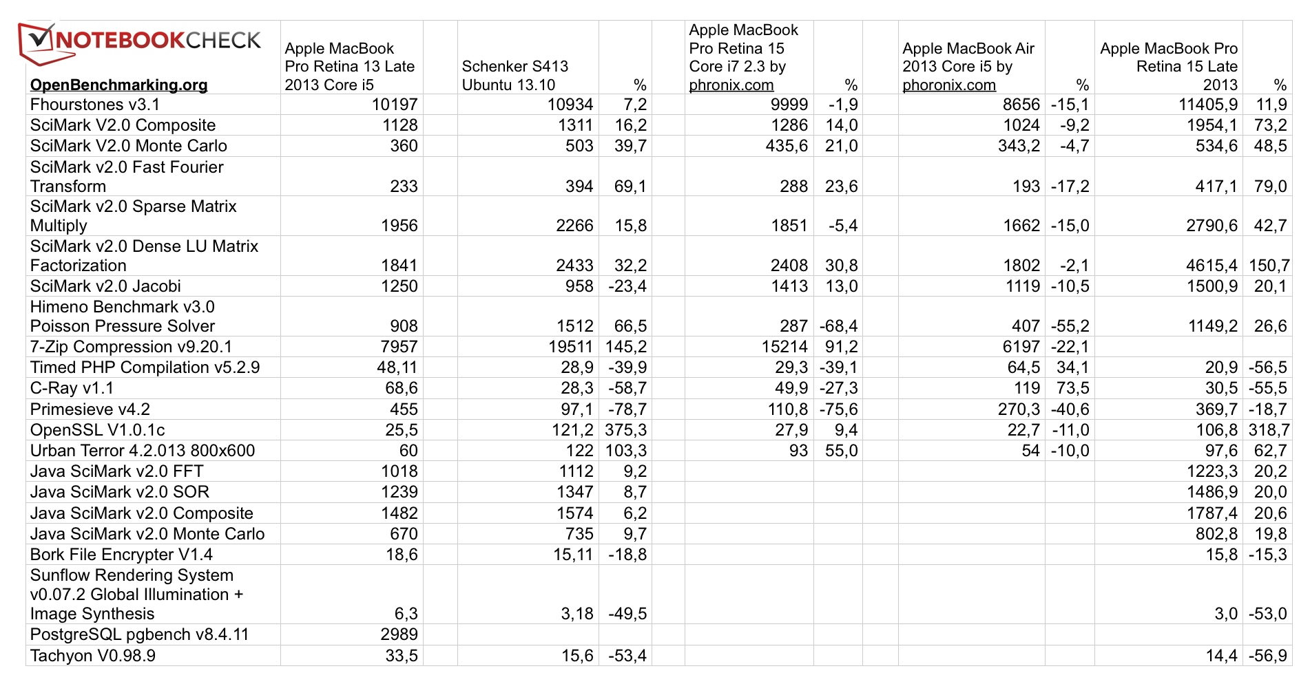 Unter Mac OS testen und vergleichen wir eine Benchmarkreihe der OpenBenchmarking.org-Seite. Die Testsuite beinhaltet prozessorlastige sowie grafiklastige Anwendungen. Das MacBook Pro Retina 15 kann sich von seinem kleinen 13-Zoll-Bruder deutlich absetzen. Die im Test der 13-Zoll-Variante genutzte CPU ist hierbei ein mit zwei Kernen ausgestatteter Intel Core i5-4258U. Je nach Testumgebung können gut 20-70% mehr Punkte erzielt werden. Herausstechend ist hierbei der OpenSSL-Test, welcher im 15-Zoll-Macbook rund drei mal so viel Punkte erzielen konnte. Im Bezug auf das MacBook Air können wir noch extremere Leistungsunterschiede feststellen. Interessant wird noch der Vergleich mit dem Dell S413, welcher mit Ubuntu diese Testsuite durchführt. Dank Intel Core i7-4750HQ ist es ein echter Konkurrent in der CPU-Klasse. In den meisten Tests wird das Dell jedoch geschlagen.
