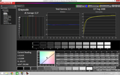 Die Analyse der Farbdarstellung erfreut mit überdurchschnittlichen Werten. In den Graustufen liegt der mittlere Wert der Abweichung bei Multimedia-Notebooks des letzten Jahres bei einem DeltaE von 9,0. Das MacBook unterbietet dies bereits im Auslieferungszustand deutlich: DeltaE Grayscale 2,11. Diese Bilanz bleibt auch bei der Auswertung der Farben mit einem DeltaE von 1,95 erhalten und liegt abermals deutlich unter den 8,3 des Durchschnitts. Nach der Kalibrierung können wir sogar Werte nahe der Null beobachten (Calman, Vergleich sRGB). Die Farbraumabdeckung (AdobeRGB1998) liegt bei 63%, sRGB bei 96% (Korrektur 20.5.2015 zufolge fehlerhaften Referenz-sRGB-Profils).