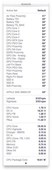 Im Stresstest mit prime95 und Furmark erreicht besonders die CPU beachtliche Werte nahe der 100 Grad. Wie schon im Abschnitt Prozessor erläutert, ist eine Unterschreitung des Basistaktes unter Windows festzustellen, jedoch nicht unter Mac OS. Nach dem Stresstest wurden im 3DMark06 16.003 Punkte erreicht und somit wurde keine Beeinträchtigung beobachtet.