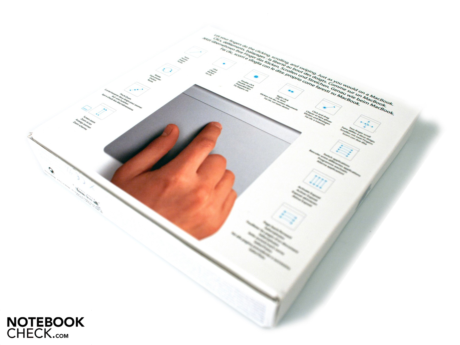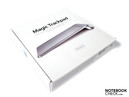 Die Verpackung ist in Weiß gehalten und gewohnt schlicht. Auf der Vorderseite befindet sich eine Abbildung des Trackpads mit einigen Worten in englischer Sprache. An den Seiten finden sich lediglich die Apple-Logos und einige Informationen sowie Barcodes. Für den Nutzer ist die Rückseite interessant, da sich dort alle Gesten finden, die das Trackpad unterstützt. Insgesamt zwölf Abbildungen mit je einer kurzen Beschreibung der Geste sind anschaulich dargestellt.
