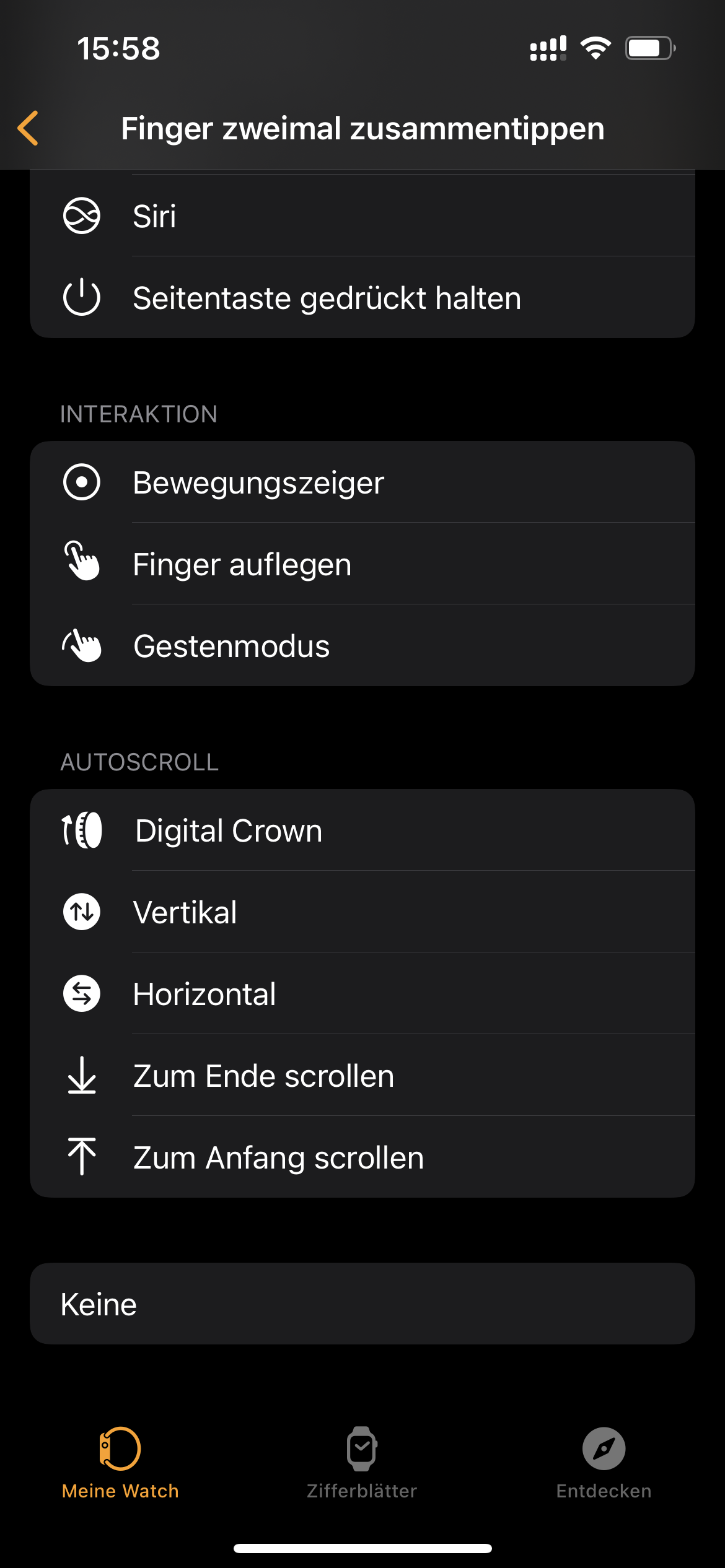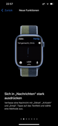 Die neue Funktion AssistiveTouch ermöglicht die Navigation auf der Uhr durch das Ballen der Faust und das Zusammentippen von Daumen und Zeigefinger. Dabei kann zwischen einer einfachen und doppelten Geste unterschieden werden, sodass insgesamt vier Eingabe-Möglichkeiten vorhanden sind. Im Alltag funktioniert dies überraschend gut und ist vor allem dann praktisch, wenn mal nur eine Hand frei ist, ansonsten sind die direkten Eingaben über den Touchscreen meistens schneller. Die Funktion muss zunächst in den Bedienungshilfen aktiviert und kann dort auch angepasst werden.