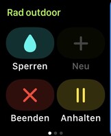 Die Trainingsapp der Apple Series Watch 7 unterstützt zahlreiche Sportarten und erkennt einige Aktivitäten auch automatisch. Mit WatchOS 8 ist beispielsweise das Fahrradfahren im Freien dazu gekommen. Wer sich aufs Rad schwingt und einfach losfährt, wird bereits nach kurzem von der Uhr gefragt, ob eine Aufzeichnung gestartet werden soll. Jede Art des Trainings kann bei Pausen ausgesetzt oder manuell pausiert werden. Neben dem Beenden der Einheit ist es im gleichen Menü auch möglich, den Eingabeschutz beim Kontakt mit Wasser zu aktivieren, sodass das kühle Nass oder Regen keine Eingaben auf dem Touchscreen ausführen kann.