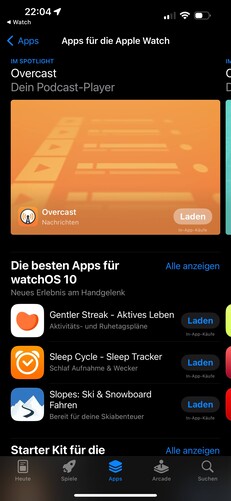 Unter "Entdecken" listet die App neue Funktionen von watchOS 10, und bietet Zugriff auf Benutzerhandbuch und Tipps. Außerdem gibt es Hilfe zur Personalisierung der Smartwatch und einen Zugang zum App Store für Watch-Apps.