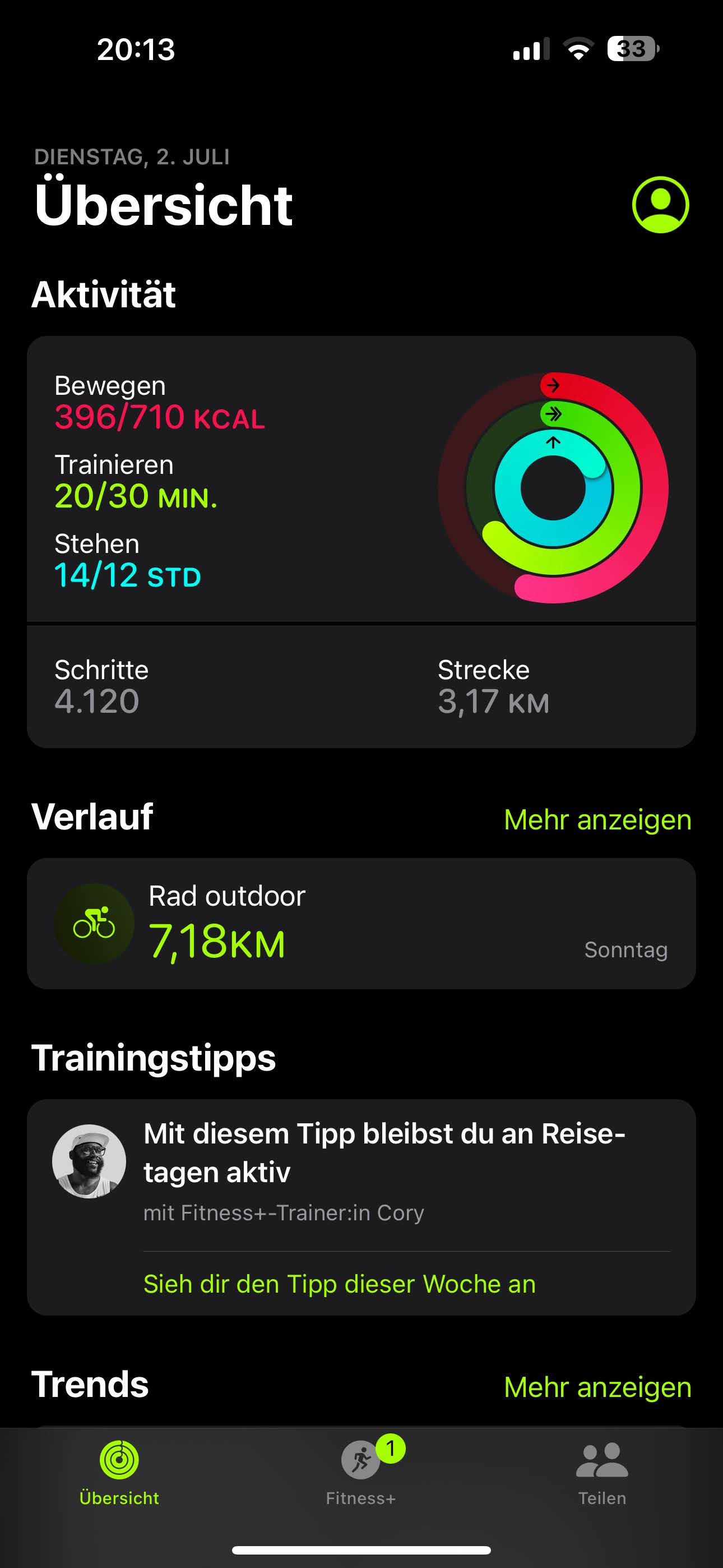 Entwicklungen sind nach kurzer Zeit bereits in der Health-App einsehbar. Die Software ermittelt einen Schnitt an Trainingsminuten für eine Woche oder setzt die Tageswerte ins Verhältnis mit dem Durchschnitt zu dieser Tageszeit.