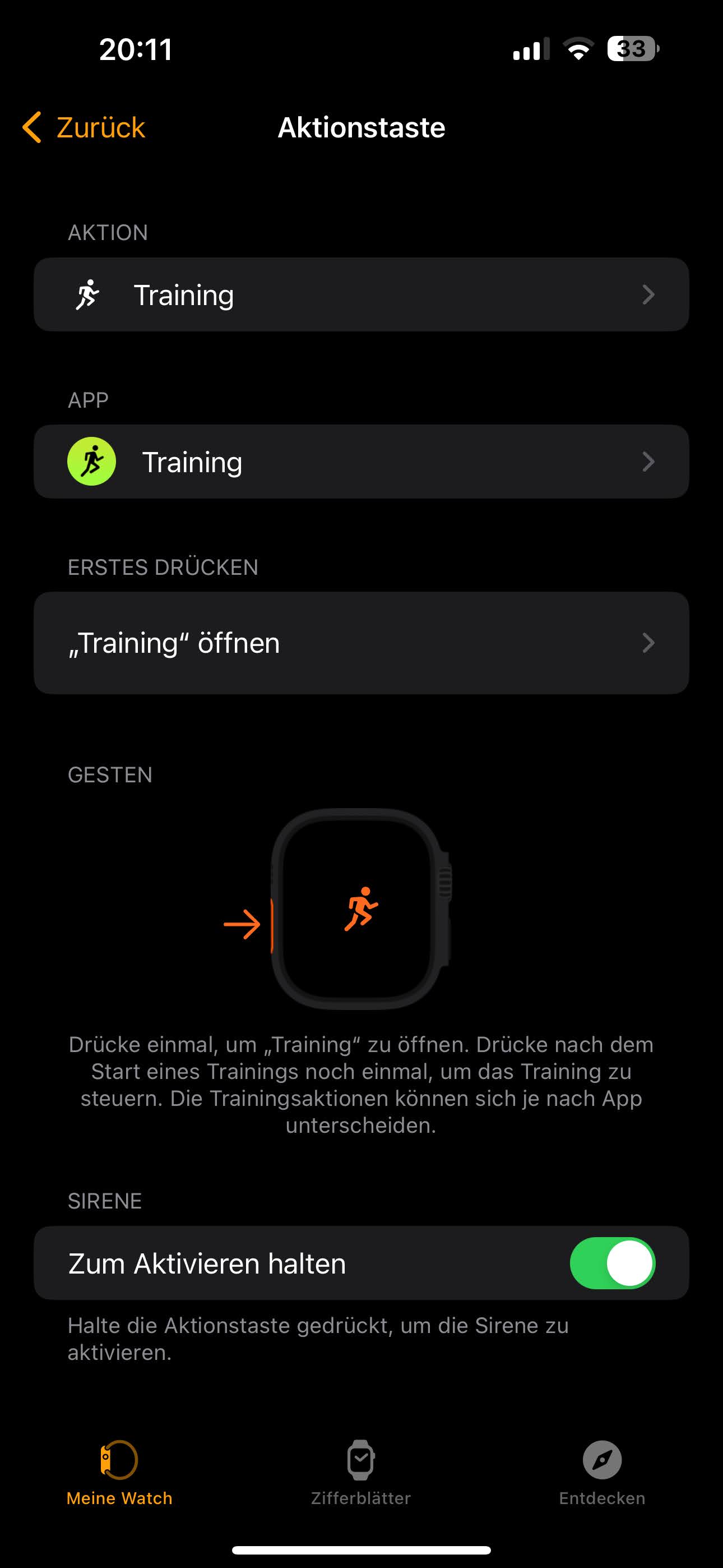 Doppeltippen der Seitentaste öffnet Apple Pay, langes Drücken dagegen ein Notfallmenü. Hier gibt es Zugriff auf die Sirene, den Notfallpass, die Notruffunktion und den Trackback-Kompass. Die Actiontaste auf der gegenüberliegenden Seite kann individuell belegt werden. Ab Werk öffnet sie das Trainingsmenü, zur Auswahl stehen aber auch Stoppuhr, Wegpunkt, Backtrack, Tauchen oder Taschenlampe.