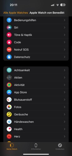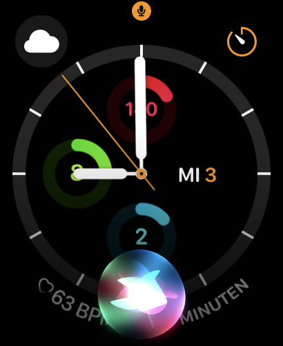 Doppeltippen auf die Krone bringt eine Übersicht der zuletzt geöffneten Programme, langes Drücken ruft Sprachassistent Siri auf den Plan. Ein Druck auf die Seitentaste öffnet das Kurzmenü mit Zugriff auf Taschenlampe, Akkukapazität, Mobilfunk- und WLAN-Einstellungen wie verschiedene Modi etwa für Theater, Flugzeug und Schlafenszeit.