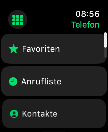 Die Telefon-App bietet Zugriff auf Ruflisten, alle Kontakte des gekoppelten Smartphones und die Mailbox. Außerdem steht ein Zahlenfeld für manuelle Eingaben zur Verfügung. Mit der Walkie-Talkie-App sind Telefonate direkt von Apple-Watch zu Apple-Watch möglich.