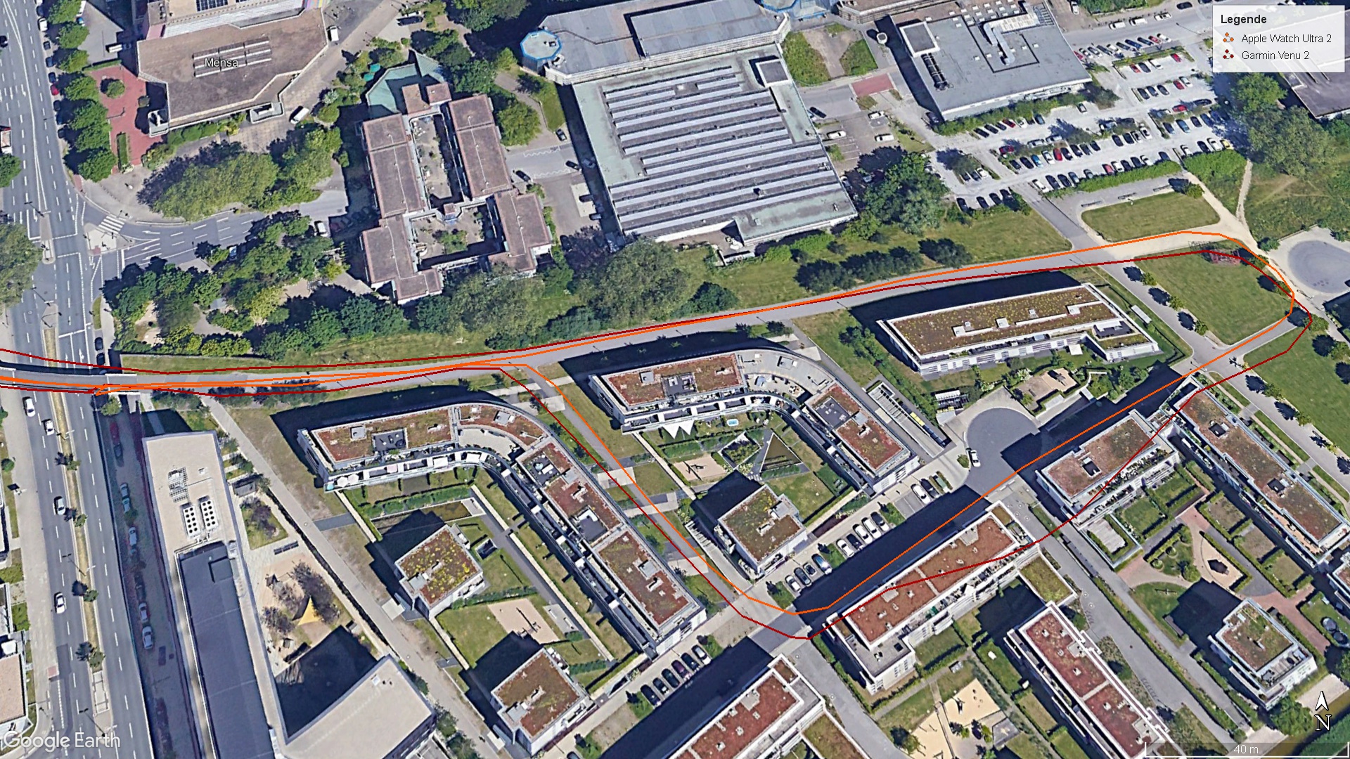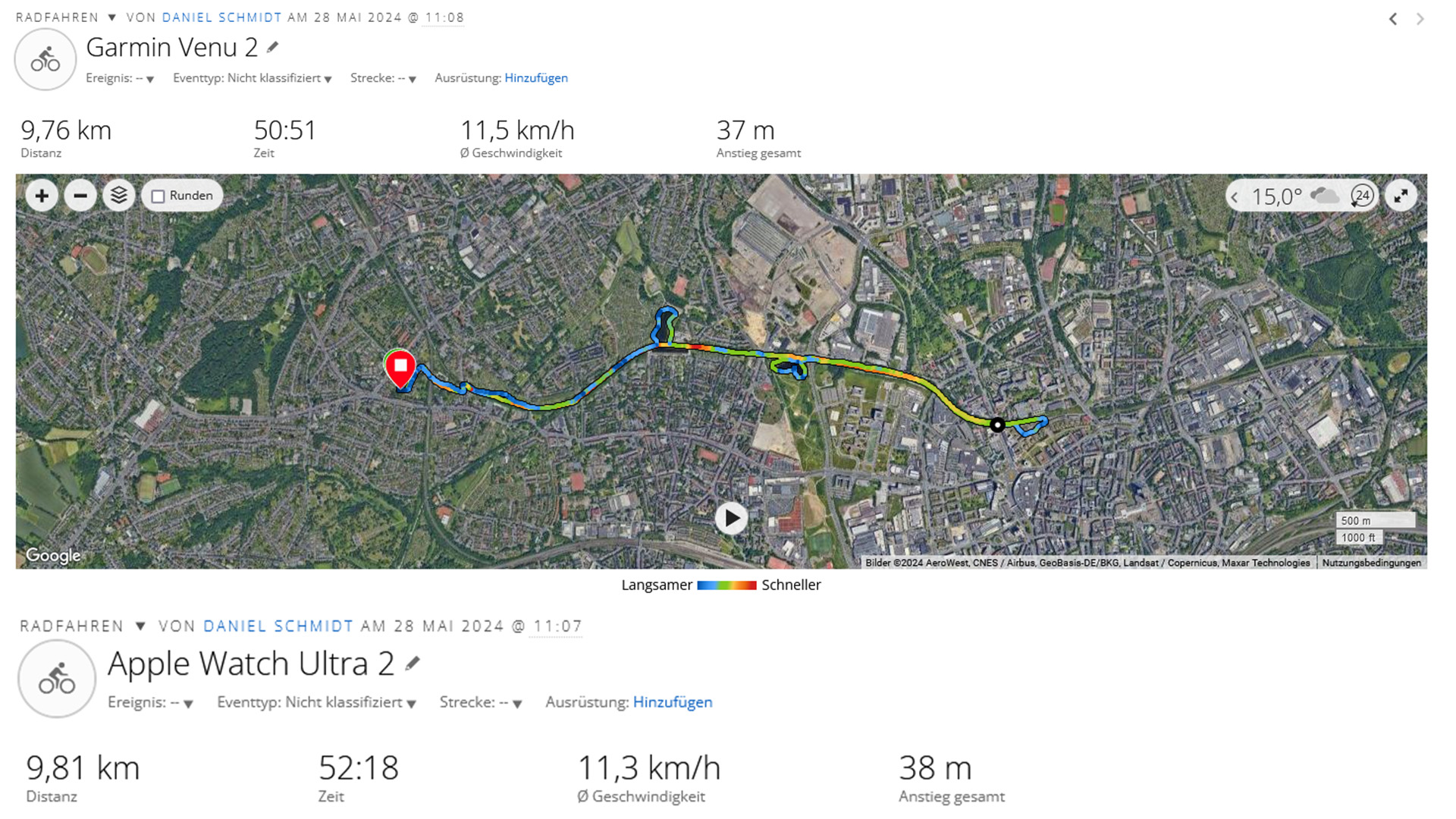 Die Apple Watch Ultra 2 unterstützt alle gängigen Satellitensysteme mit Dual-Band. Um die Genauigkeit der Messung zu überprüfen, haben wir die Apple Watch gemeinsam mit einer Garmin Venu 2 auf eine Radtour genommen. Dabei überzeugt die Aufzeichnung der Ultra 2. Die Strecke entspricht der Wegführung, auch Radien werden zuverlässig erkannt.