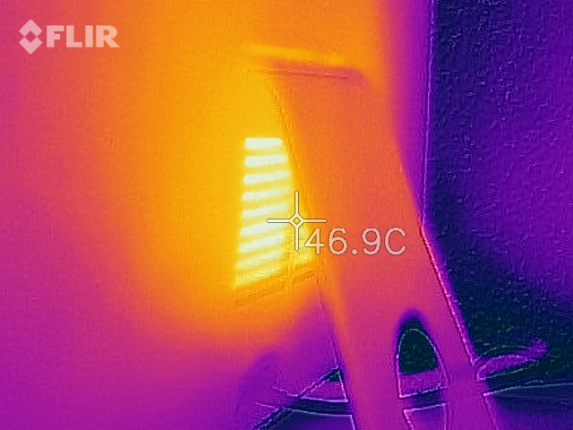 (-) Auf der Unterseite messen wir eine maximalen Wert von 46.1 °C (im Vergleich zum Durchschnitt von 33.6 °C).