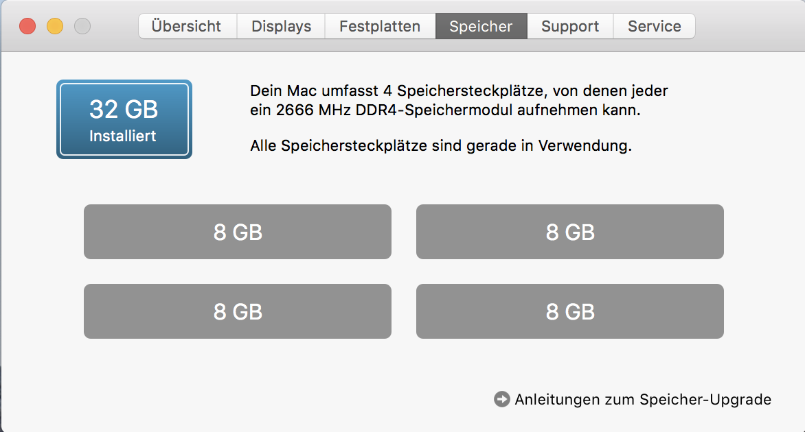 Der iMac Pro wird ausschließlich mit ECC-RAM ausgeliefert. Bei unserem Testgerät sind die vier vorhandenen Bänke jeweils mit 8 GB ausgerüstet. Maximal sind mit 32-GB-Modulen also bis zu 128 GB RAM möglich.